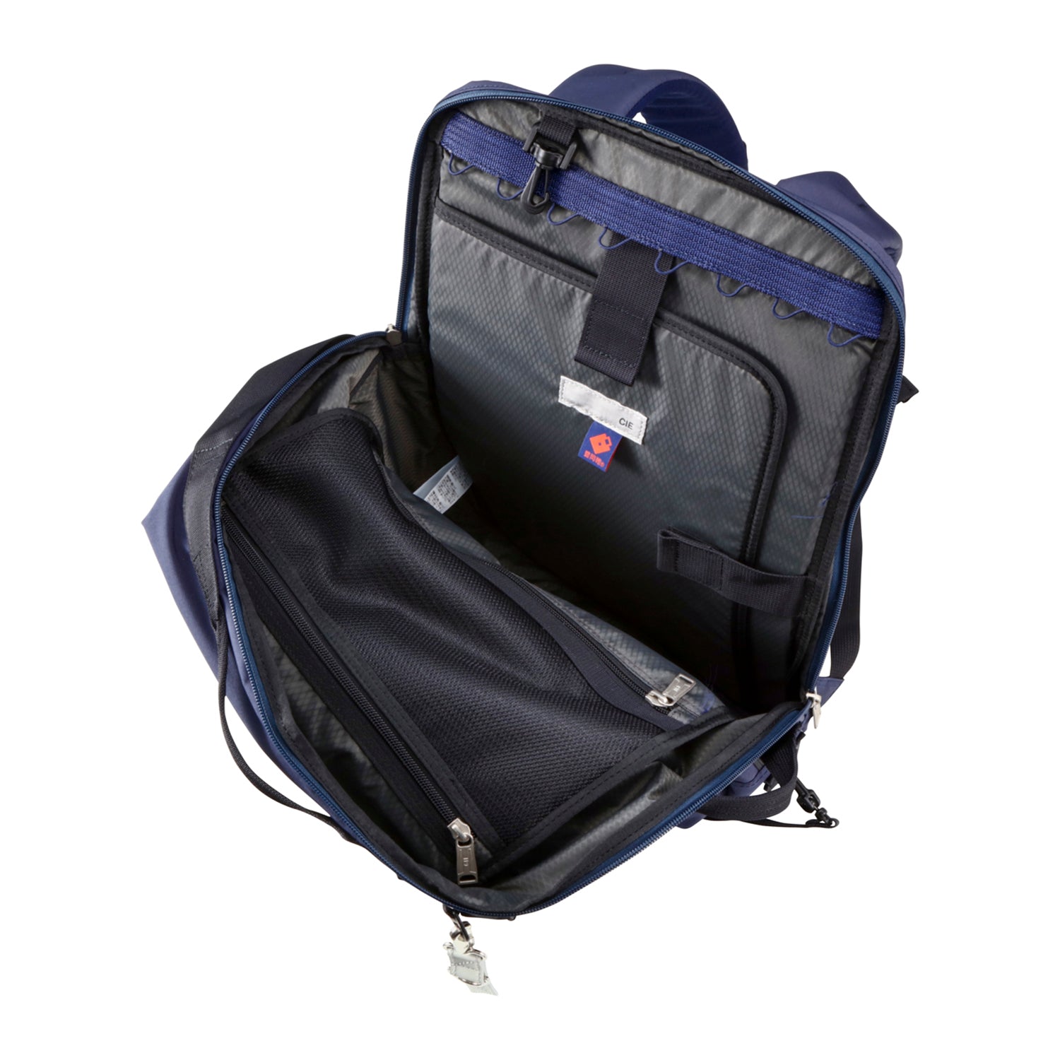 内装にはPCポケットを施し、ビジネスシーンで便利にご利用いただけます。A4ファイル対応。蓄光皮革パーツによる夜間安全対策により自転車やオートバイでも安心。