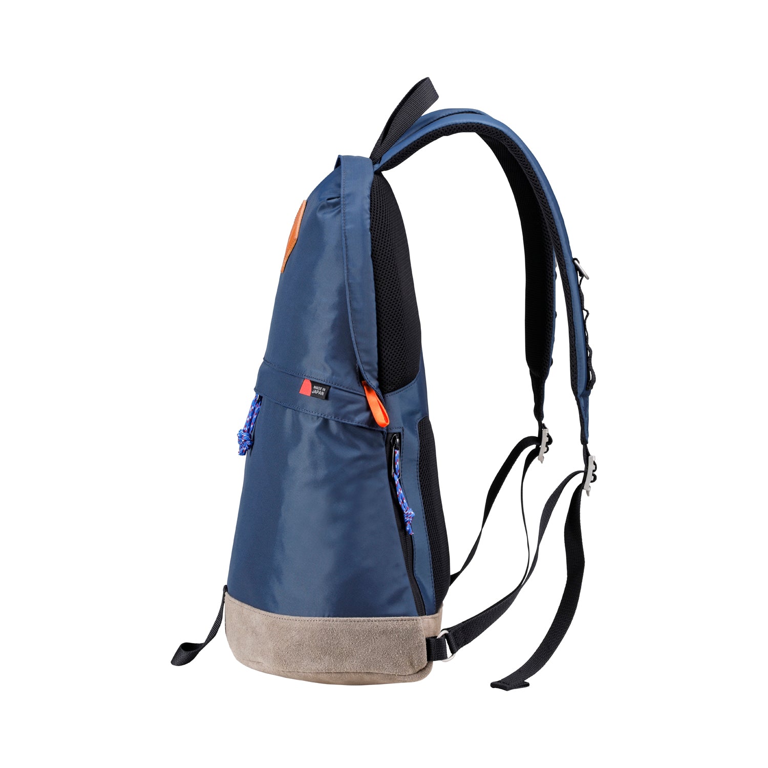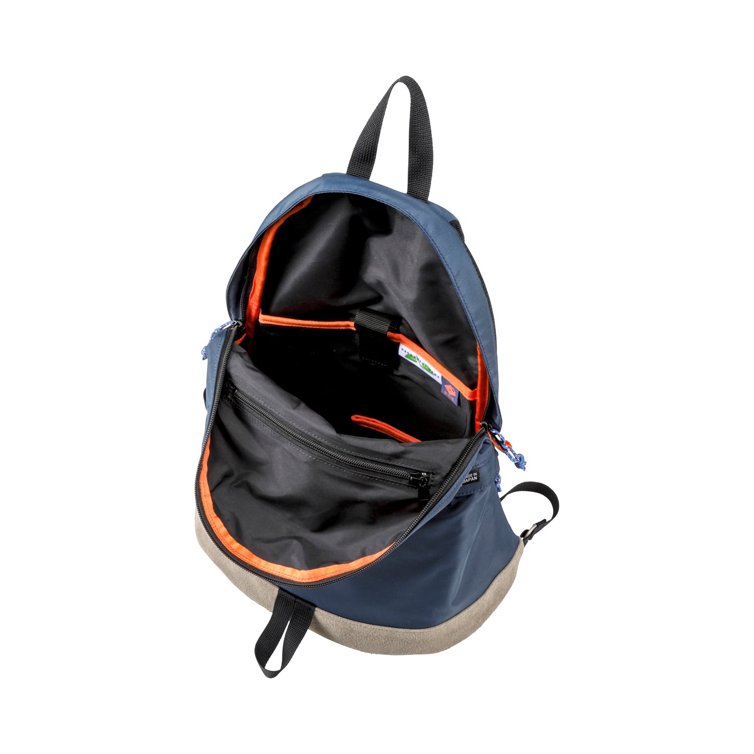 機能性については、背負った時、如何に快適であるかを追求し、背負いベルトの湾曲形状と背面の凹凸による通気性にもこだわりました。フロント上部にはヌメ革製のピッケルホルダーを逢着しました。その他、フロントポケット内に小物ポケット、ペンホルダー、レスキューオレンジのキーホルダー有り。背面には、スリ被害防止のシークレットポケット有り。